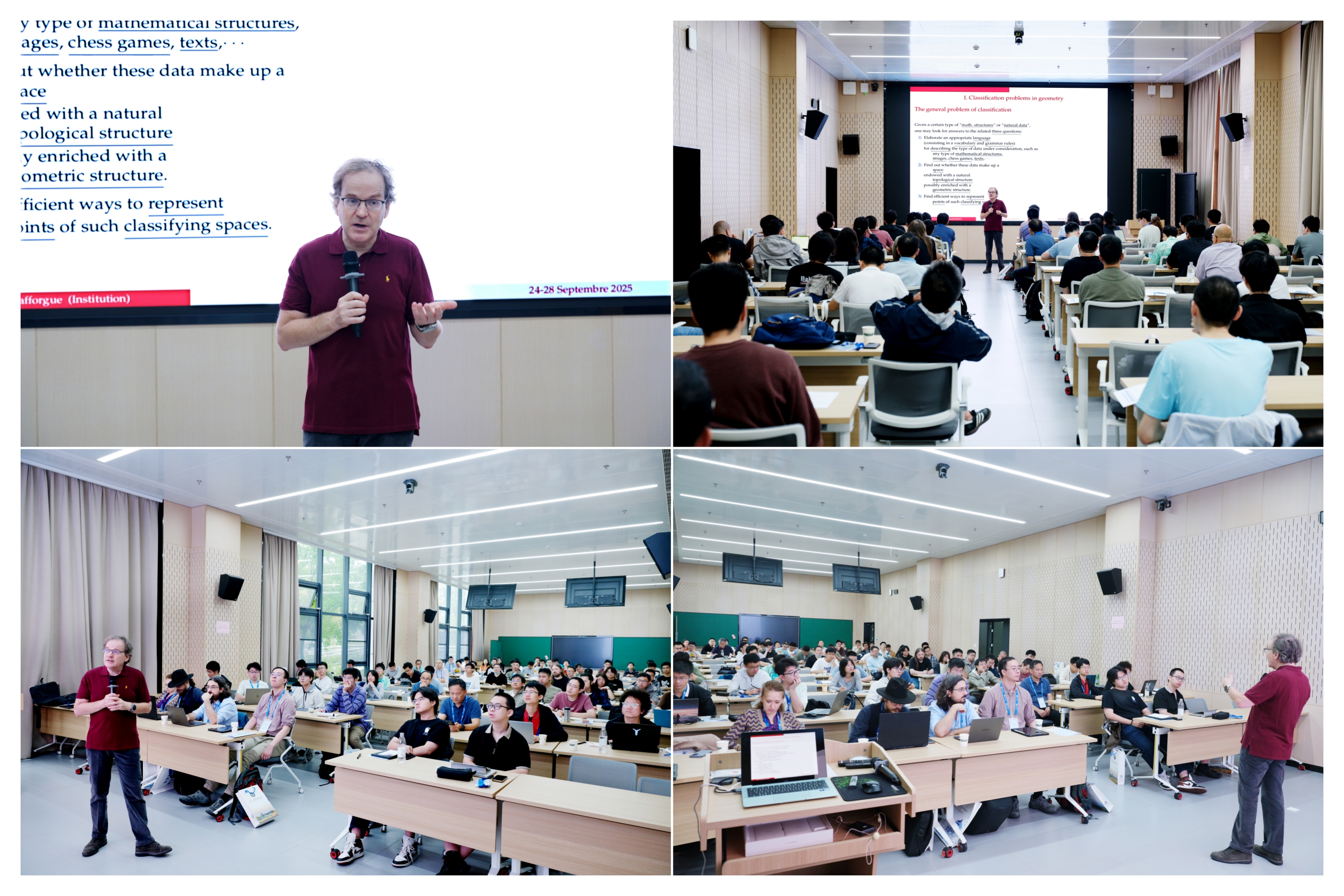 、国家天元数学中部中心及中法联合研究中心共同主办的“拓扑斯理论及其应用秋季研讨班”(Autumn School on Topos and Applications)在武汉大学雷军科技楼B102报告厅成功举办。本次研讨班聚焦拓扑斯理论的现代发展与跨学科应用,特邀菲尔兹奖得主、法兰西科学院院士洛朗·拉福格(Laurent Lafforgue)教授及其团队开设短课程和学术报告,吸引了来自清华大学、中国科学院数学与系统科学研究院、复旦大学、中国科学技术大学和牛津大学、柏林自由大学、里昂高等师范学院等国内外多所高校及研究机构的学者、博士后和研究生参与,旨在增进学术交流,促进人才培养。