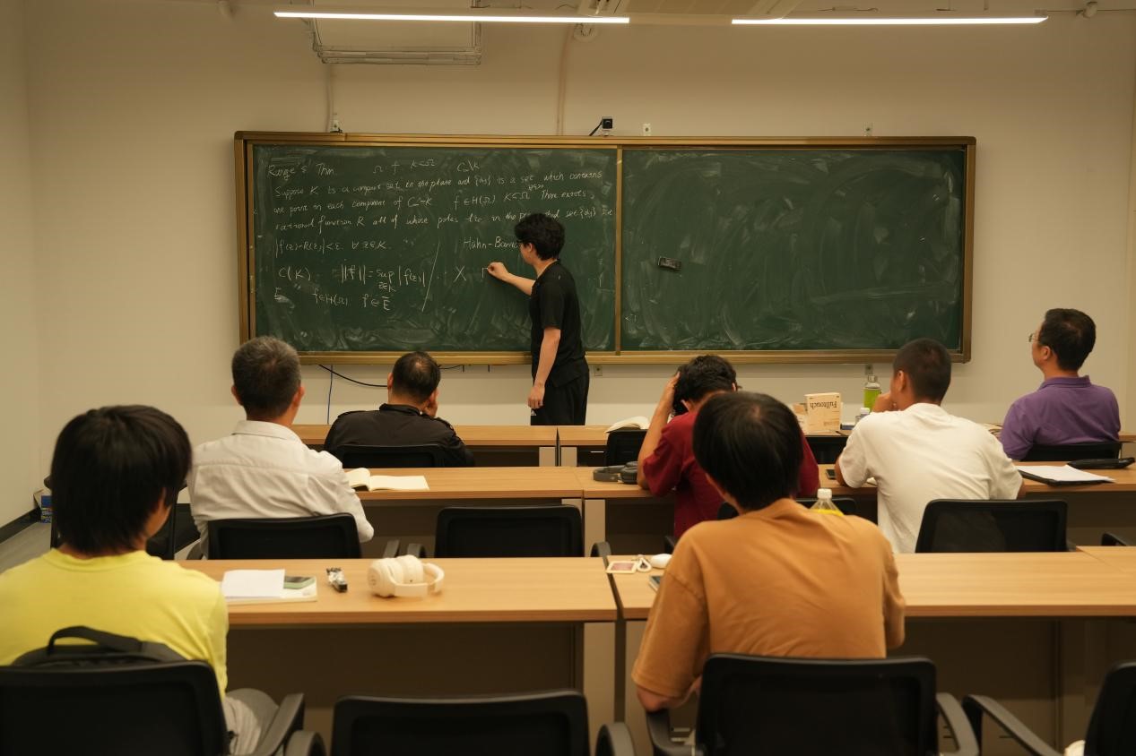 The complex analysis seminar has been successfully completed in seven sessions. The first three sessions were led by Yu Leyuan, an undergraduate in the 2023 Mathematics and Applied Mathematics Honors Class, while the last four were co-led by Yu Leyuan and Fang Zijin from the same cohort. In the initial lectures, Yu Leyuan provided a rigorous and well-structured exposition of the theoretical foundations of factorization theorems, conducted an in-depth analysis of Jensen’s formula, and offered insightful interpretations of the nature of the zero distribution of entire functions. The seminar also focused on the Weierstrass Factorization Theorem in the complex plane, where Yu demonstrated the constructive approach behind its proof. Building upon this, Professor Zhang extended the theorem to the general case on simply connected domains using an existence-based method, offering original and enlightening theoretical insights. Notably, Fang Zijin proactively supplemented the detailed aspects of Professor Zhang’s explanations, showcasing the teamwork and deep engagement among the participating students.